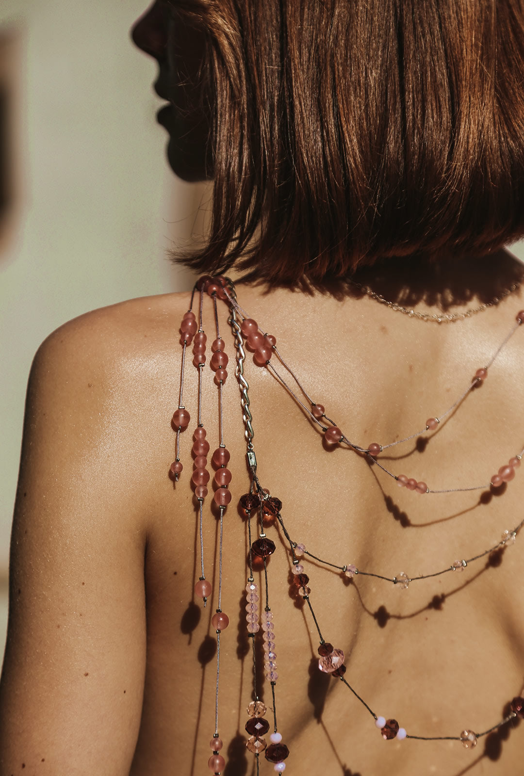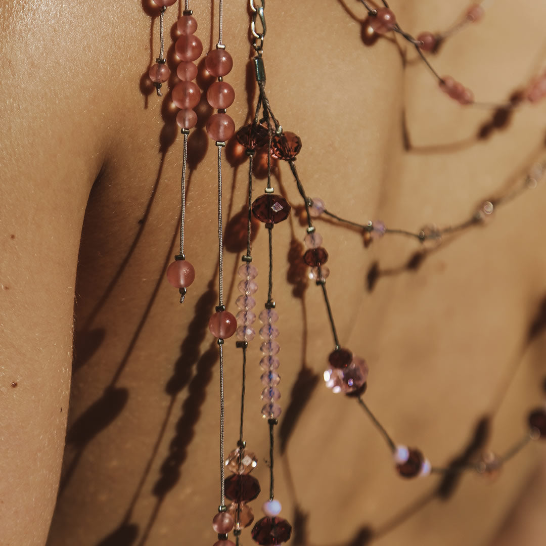 Colgante con cadena en acero con cascadas de piedras semipreciosas y cristales.