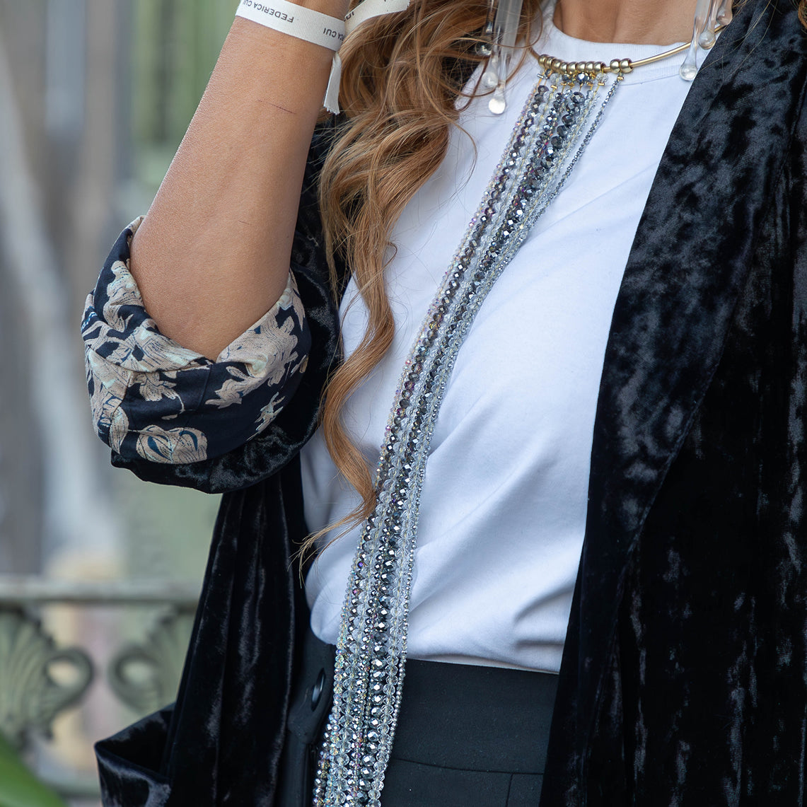 COLLAR LARGO CASCADA PLATA BY CARLA. Collar largo cascada plata, gargantilla rígida color dorada con cierre mosquetón y alargue de cadena, del mismo caen en cascada 9 tiras de cristales combinados entre sí , tanto en tamaño como en gamas de colores plateados