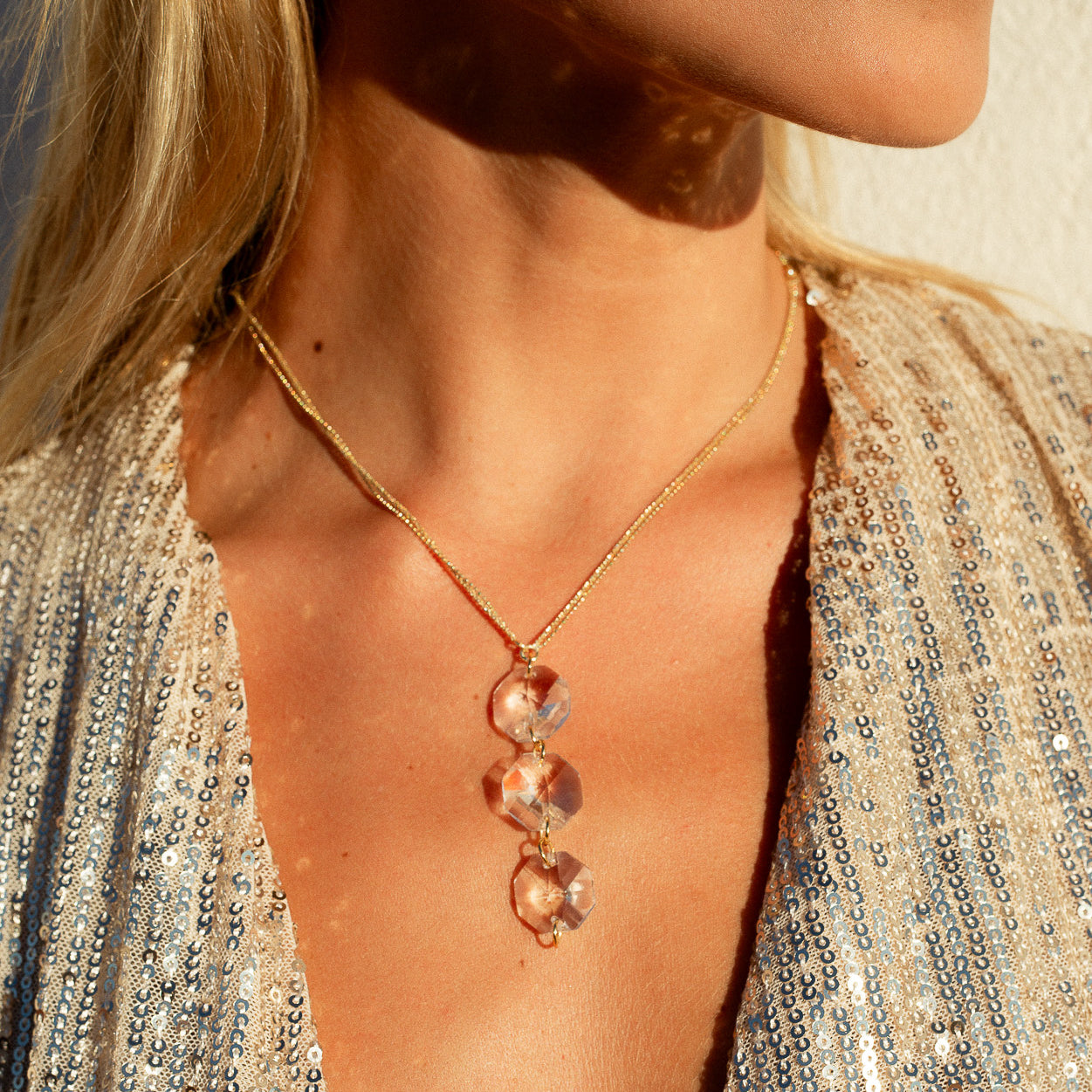 GARGANTILLA CRISTAL DE BOHEMIA 3 BY CARLA. Gargantilla de cadena dorada doble de acero bañado en oro, con 3 cristales colgando, cierre mosquetón, con alargue de 5 cm.