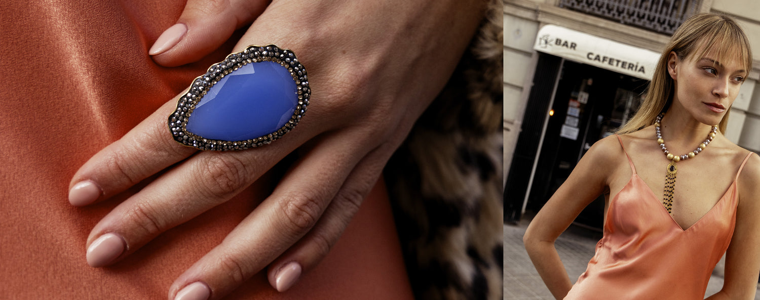 Utilizamos piedras (ojo de tigre, con un tratamiento sintético para conseguir 11 tonos diferentes), bronce, baño de oro de 18 quilates (5 micras) y cristales Swarovski.