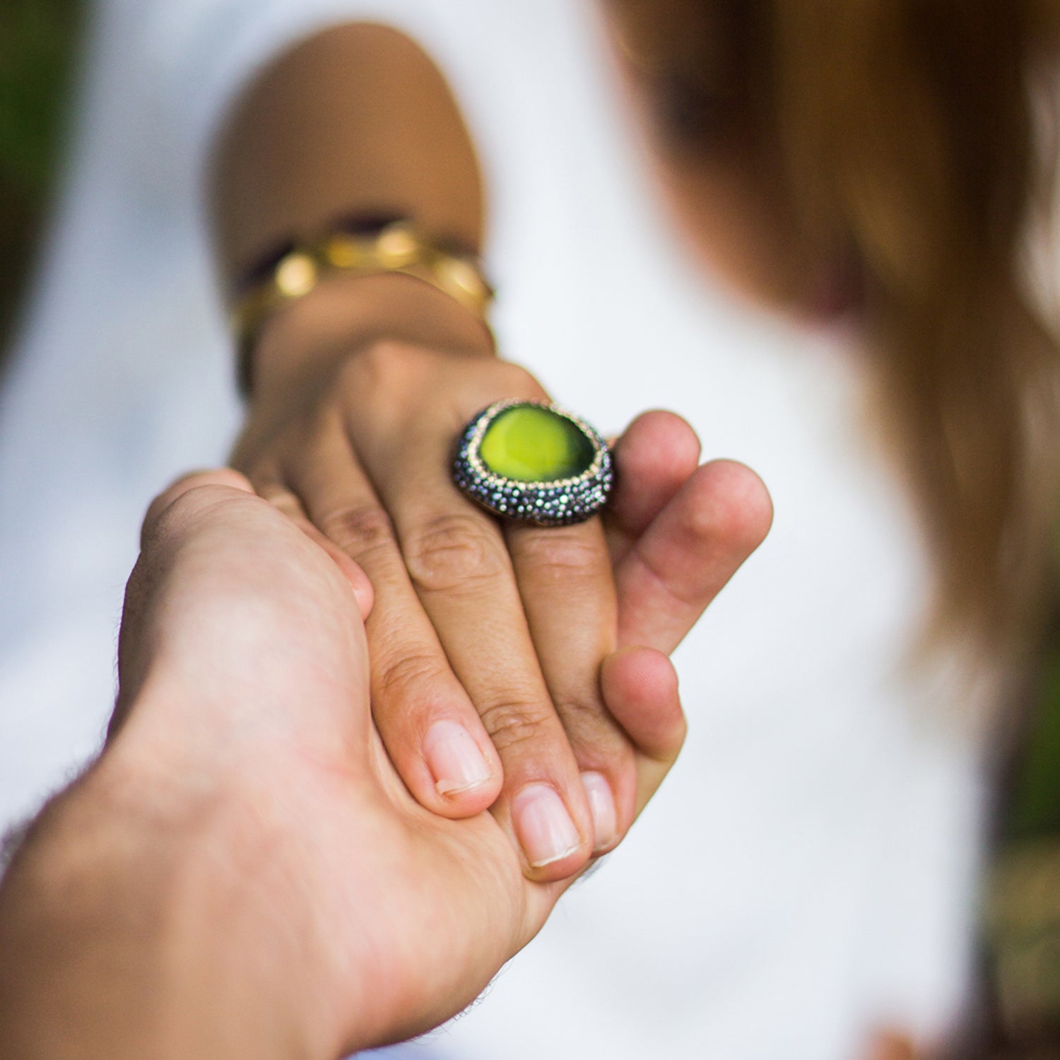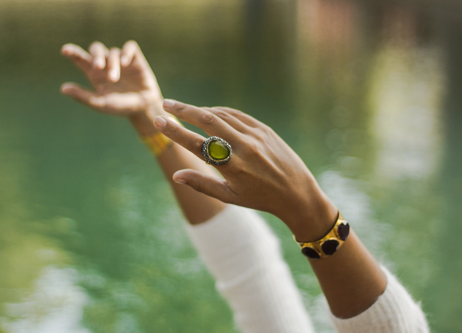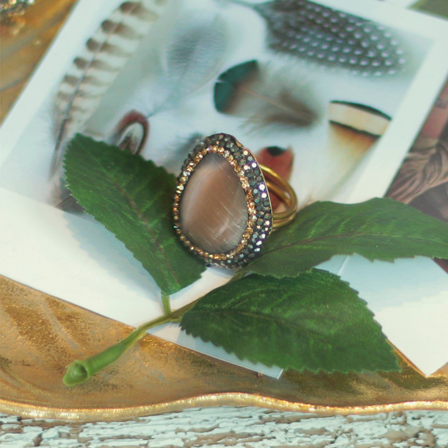 Anillo compuesto de un cristal tratados sintéticamente para su teñido y así lograrlo tonos que conforman la marca incrustados sobre una base de silicona bordeados de circonitas en todos dorado y negro , colocadas a mano sobre una base de bronce bañada en oro tamaños de referencia medio da igual el tamaño de tu dedo, son ajustables.