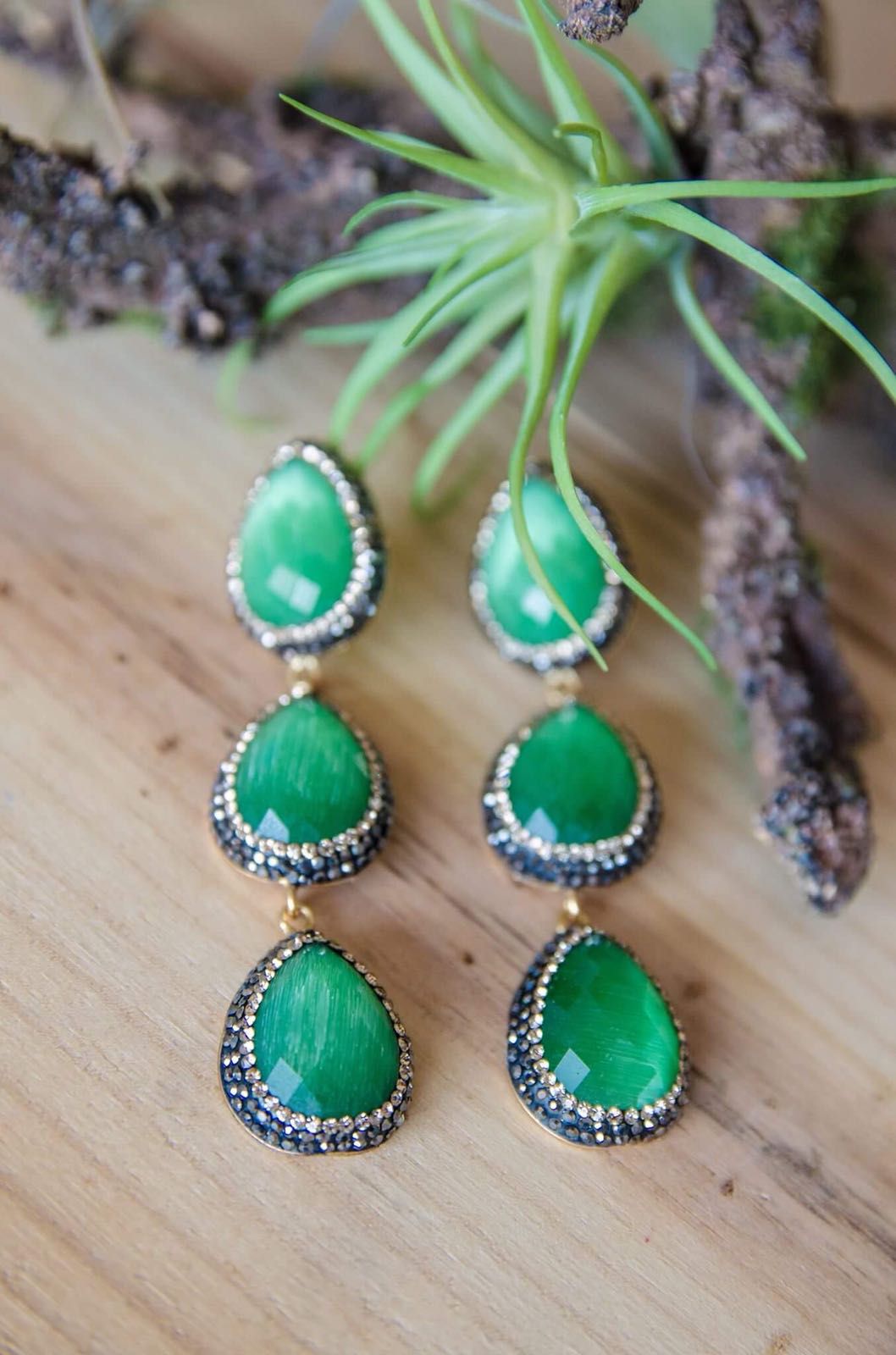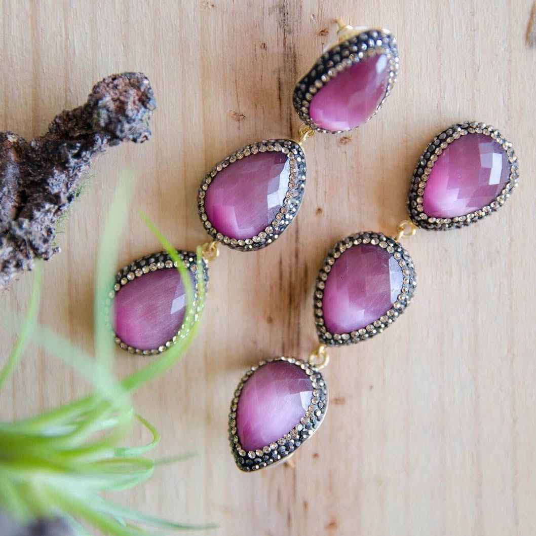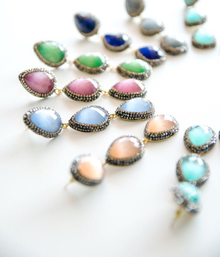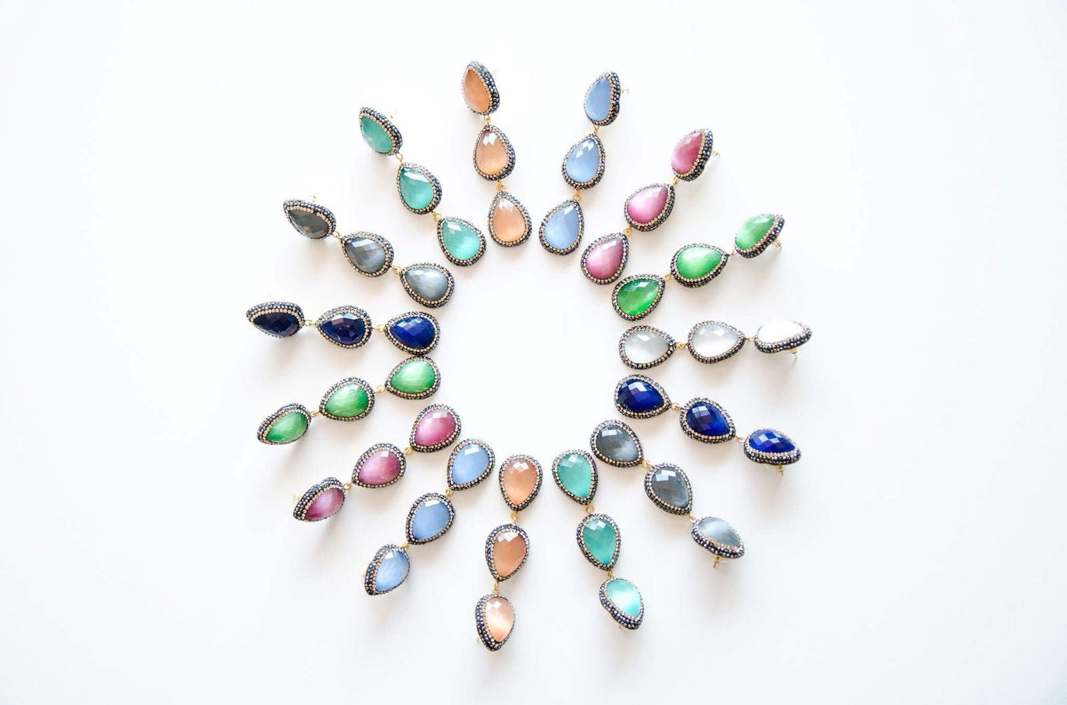 Pendiente en forma de gotas bañado en oro, cristales tratados sintéticamente pata su teñido, incrustados en base de silicona, bordeados de circonitas grises, negras y doradas incrustadas a mano media.