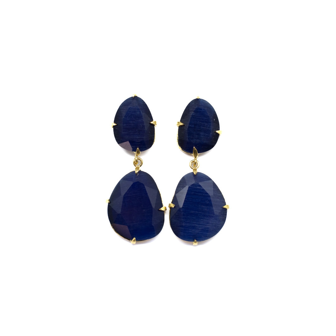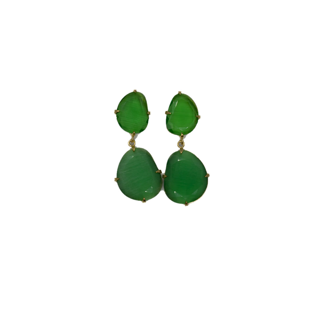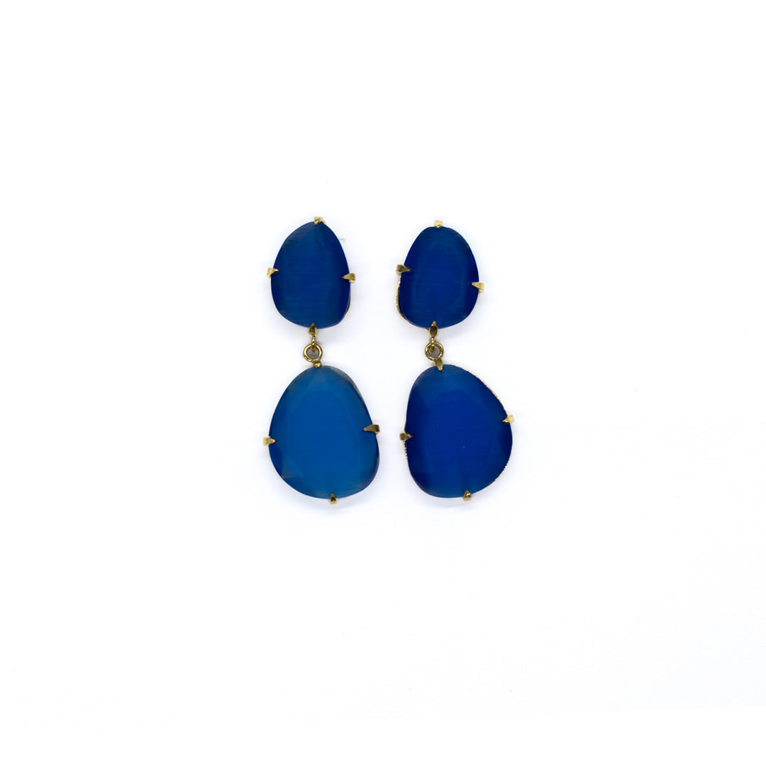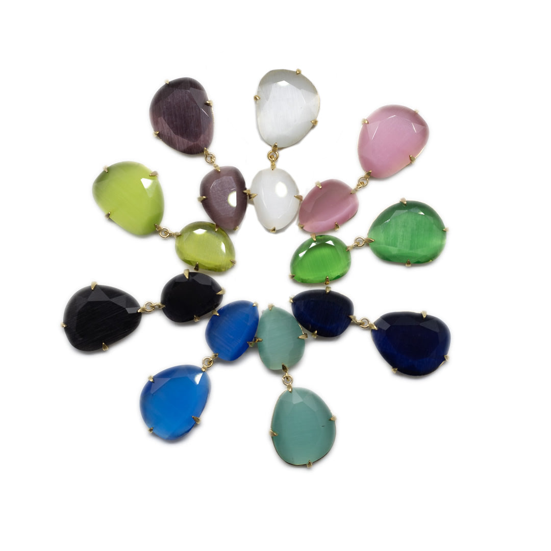 Tamaño 4,8 pendiente doble con tilla, bañado en oro 18k, 3 micras cristal tratado sintéticamente para lograr los colores, el cristal va encajado a golpe de martillo de forma artesanal.
