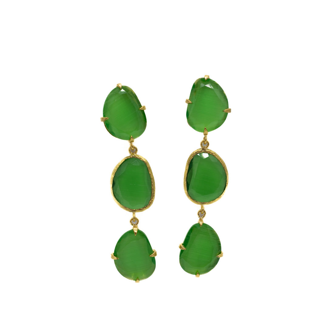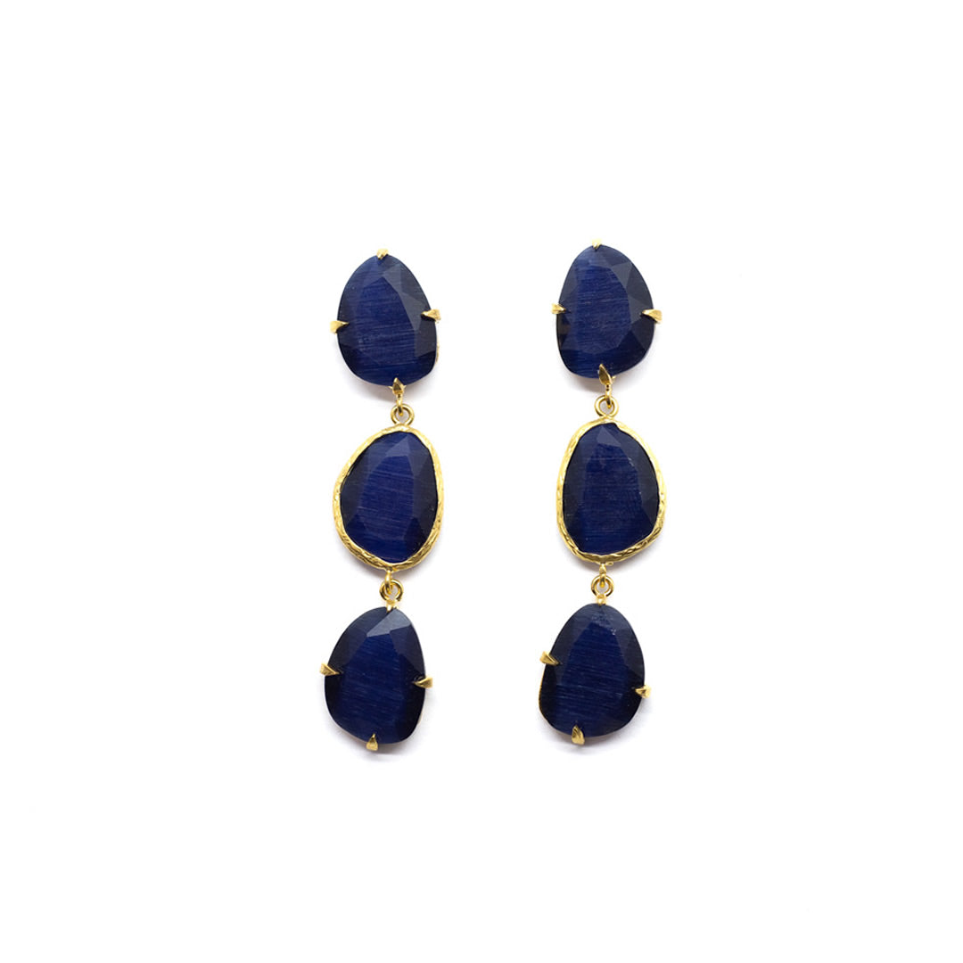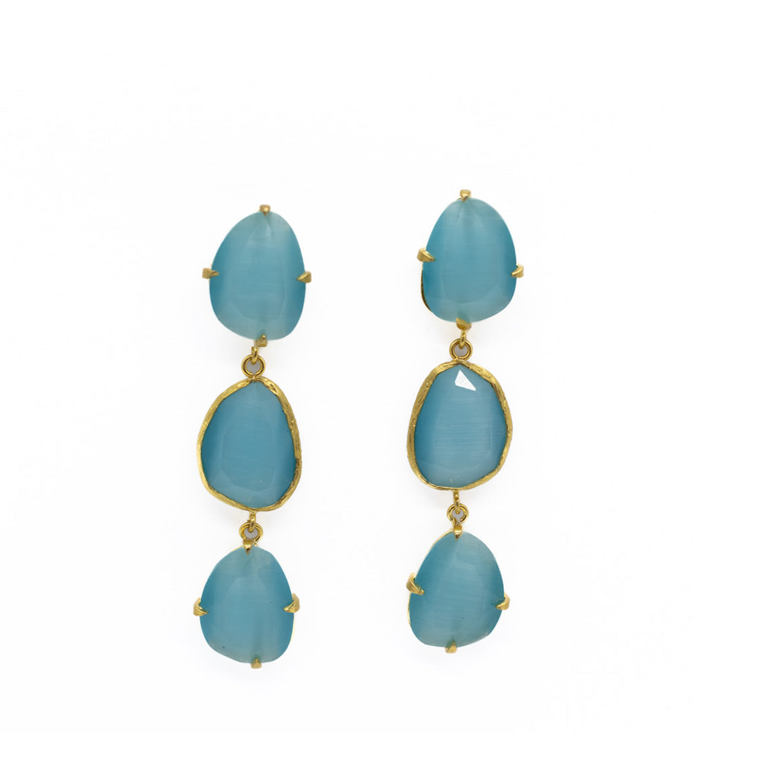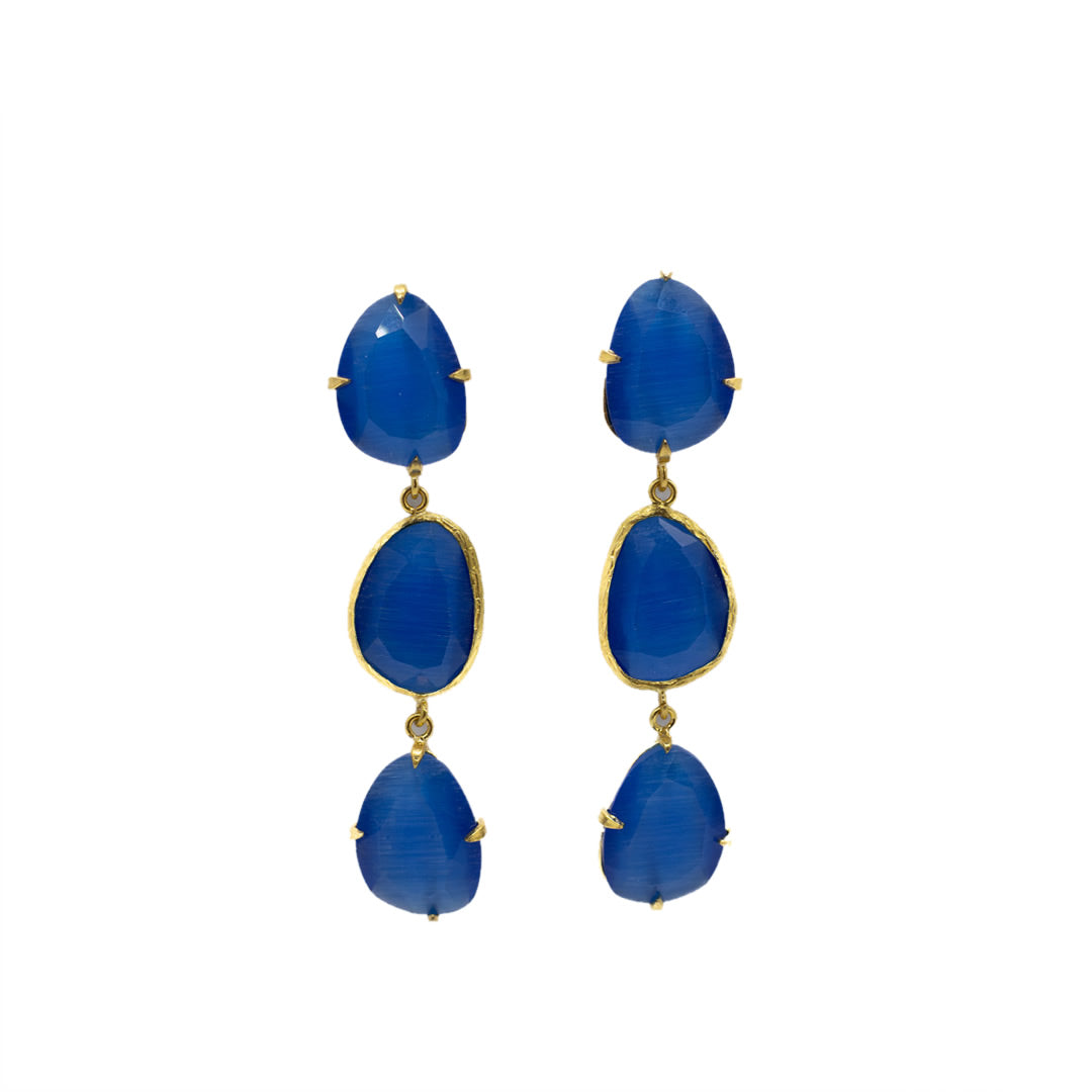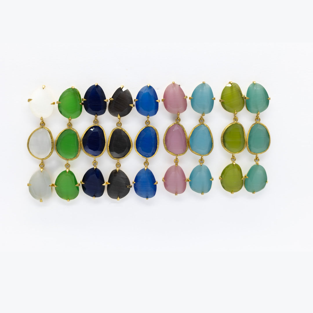 Pendiente triple con tilla, bañado en oro, cristal tratado sintéticamente para lograr los colores, el cristal va encajado a golpe de martillo de forma artesanal.