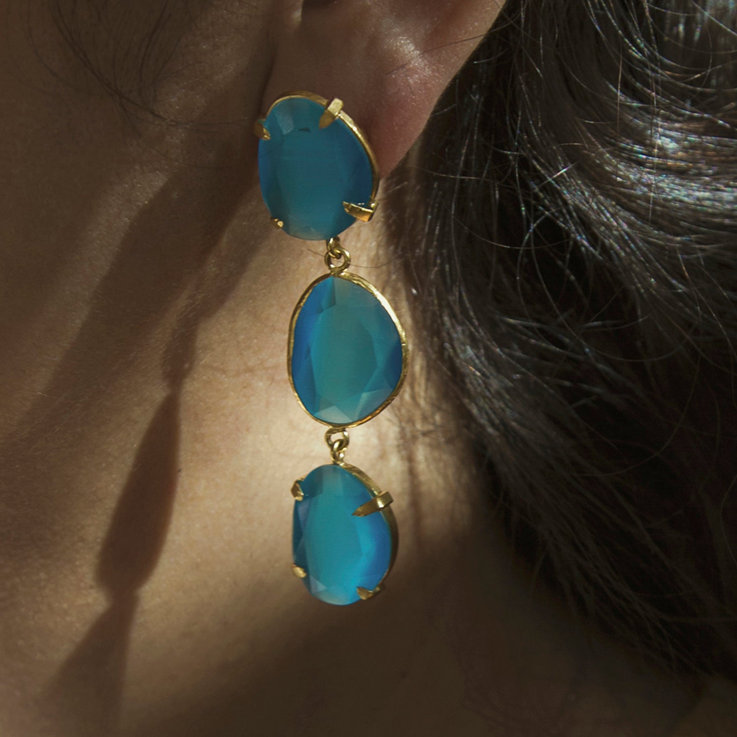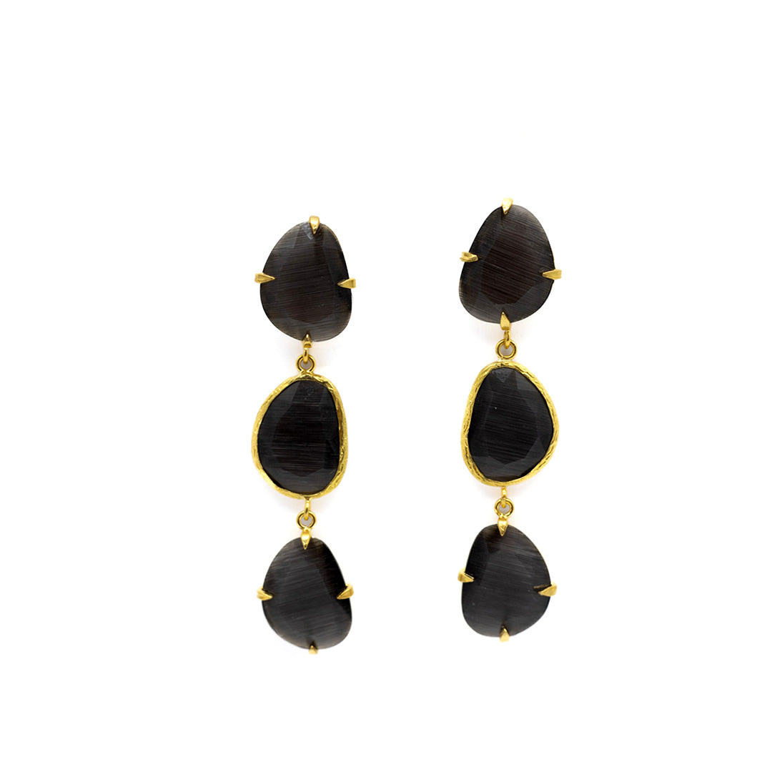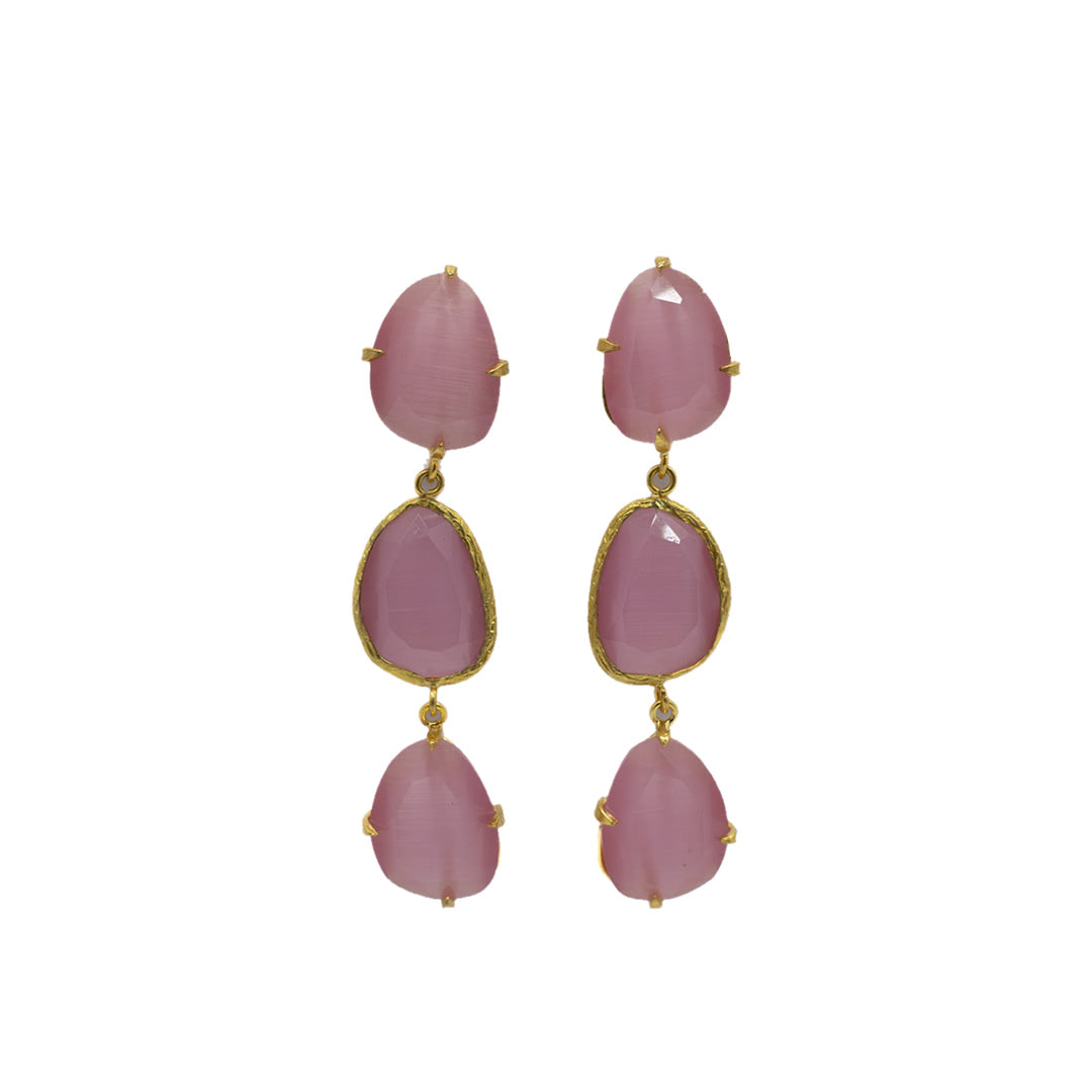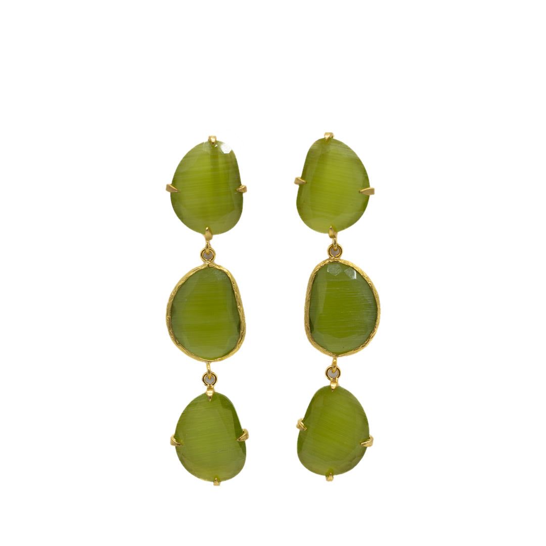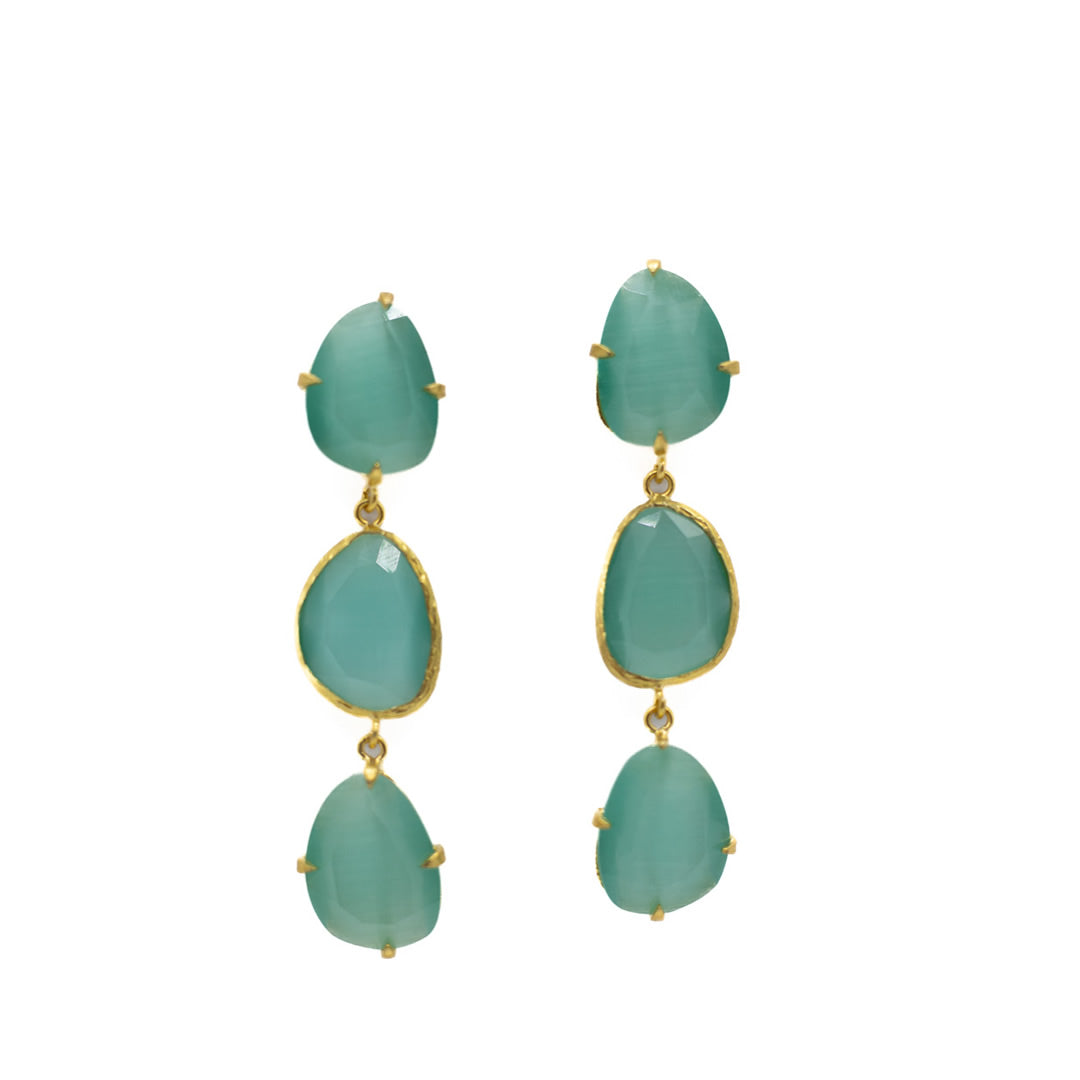 Pendiente triple con tilla, bañado en oro, cristal tratado sintéticamente para lograr los colores, el cristal va encajado a golpe de martillo de forma artesanal.