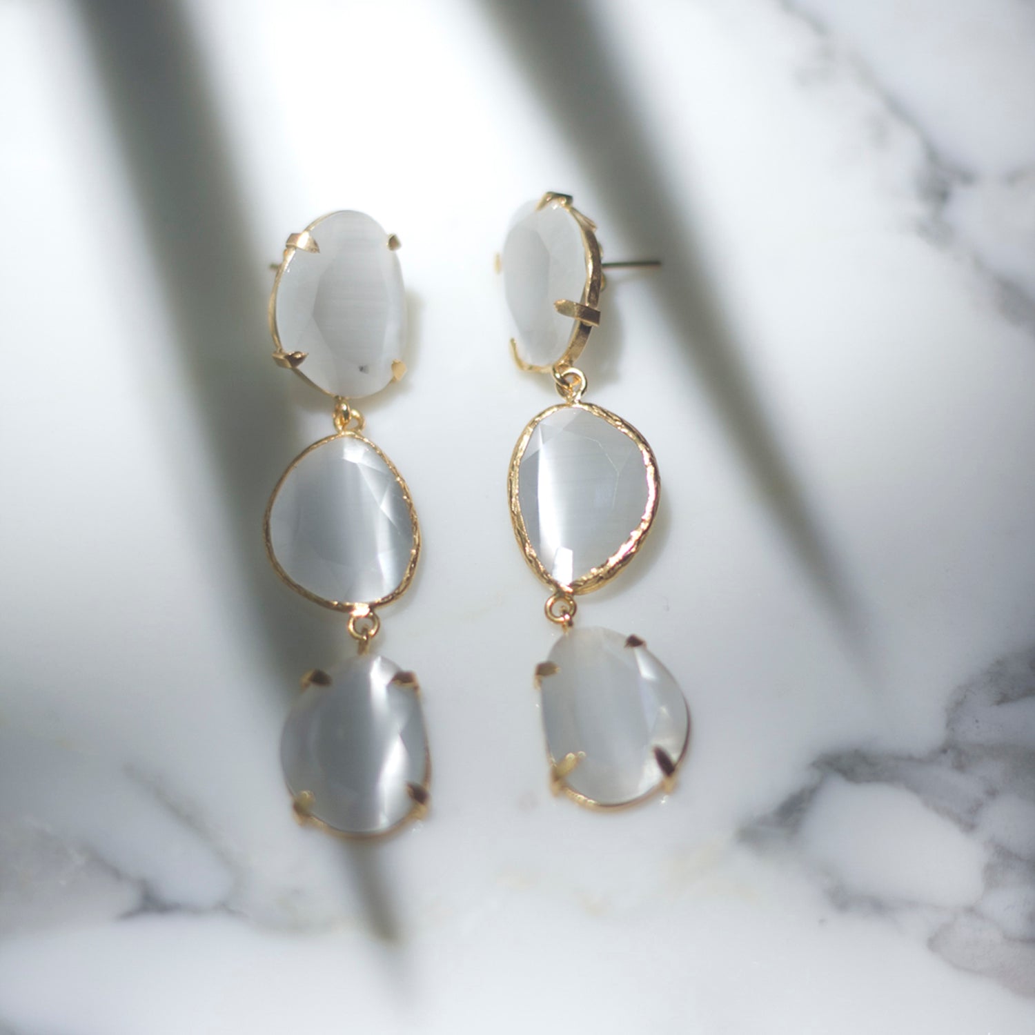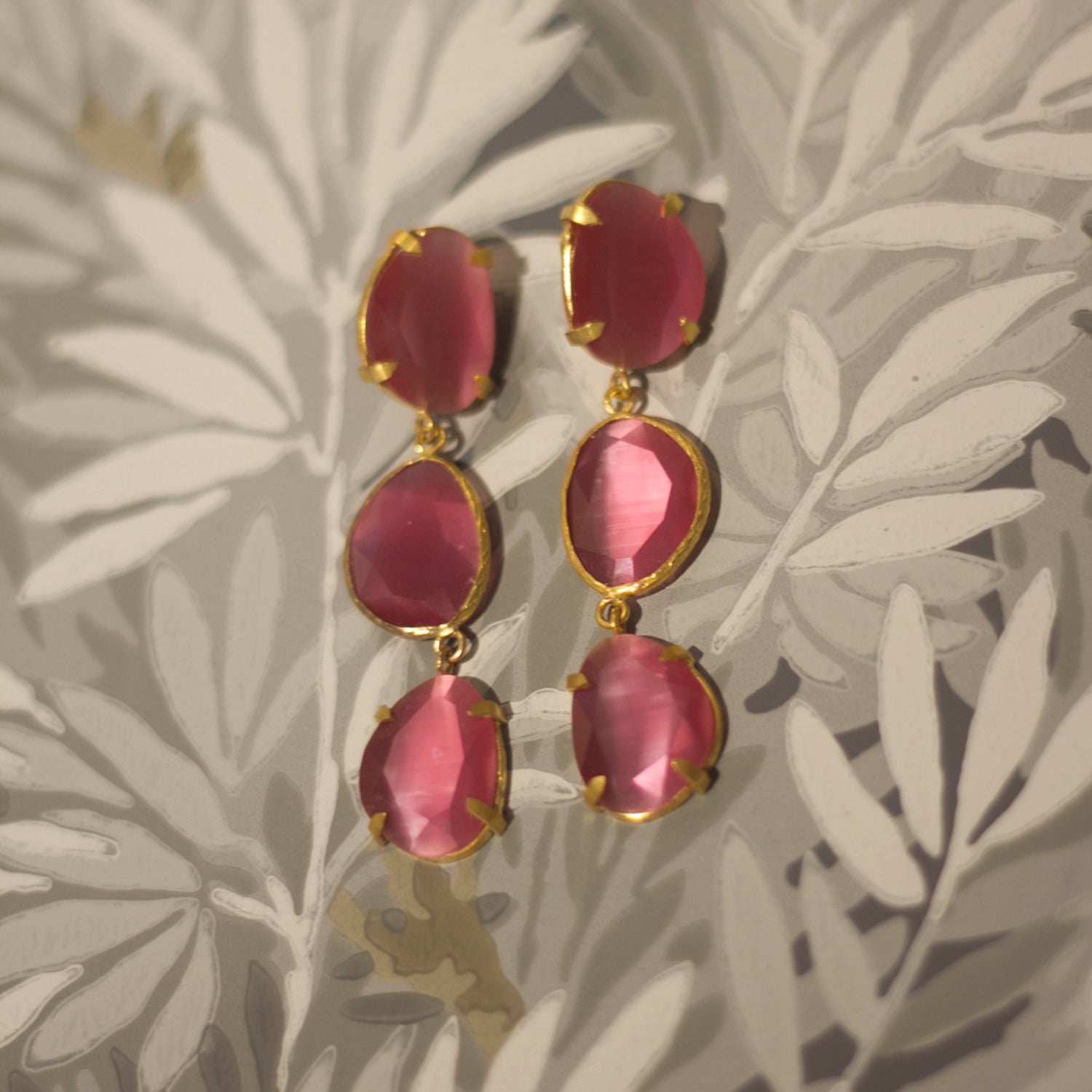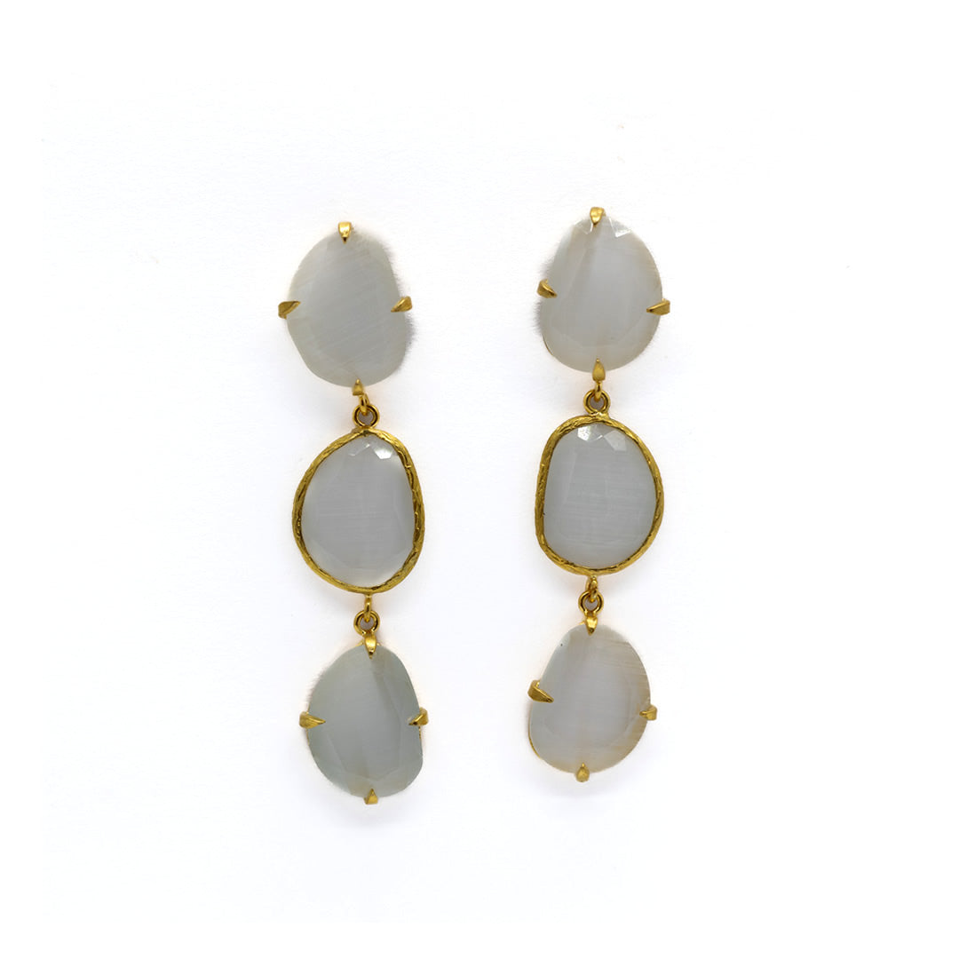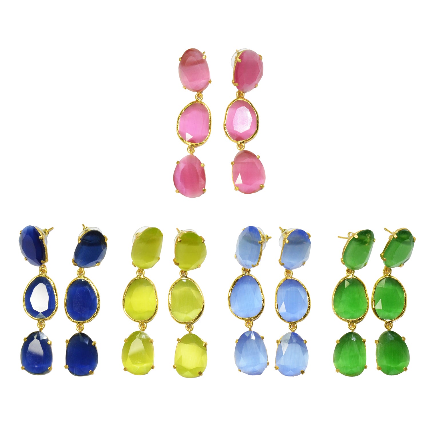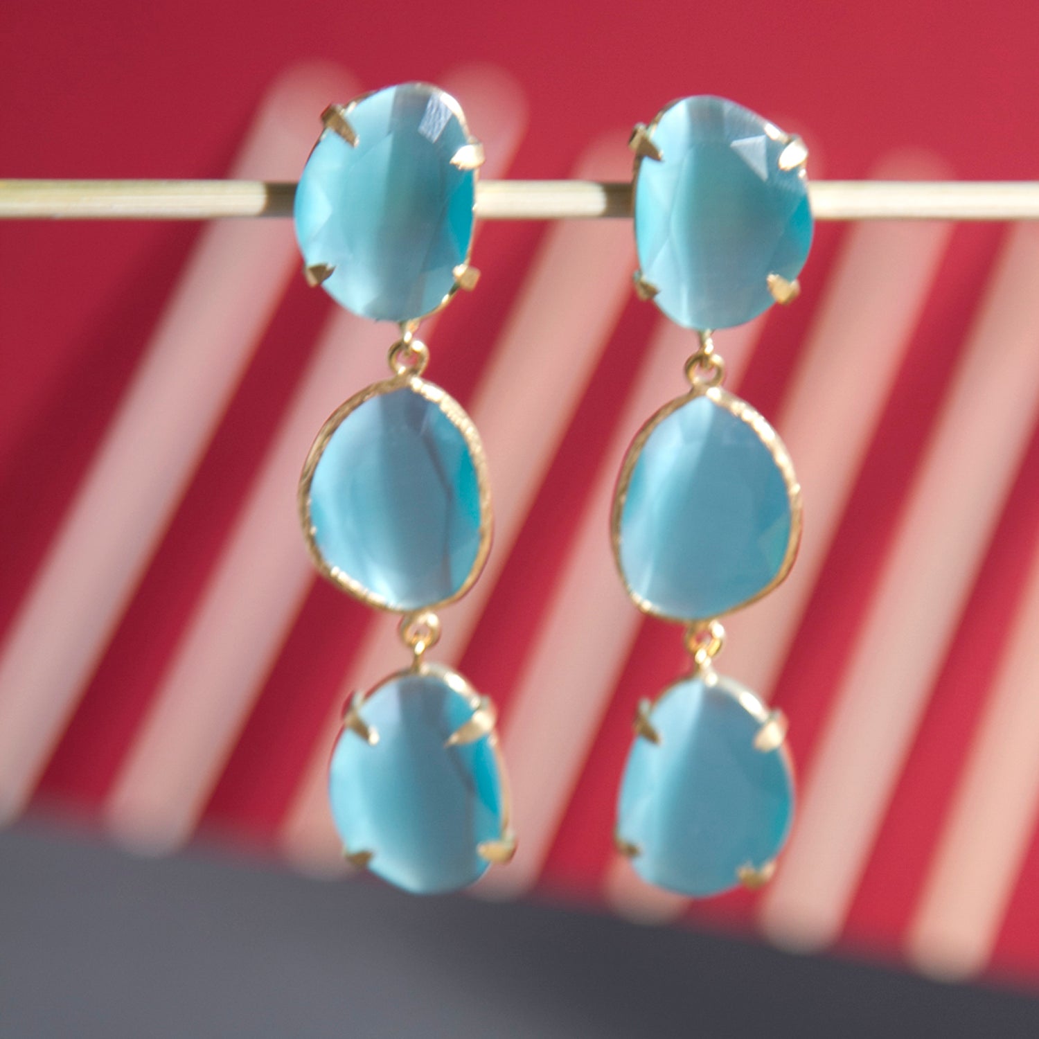 Pendiente triple con tilla, bañado en oro, cristal tratado sintéticamente para lograr los colores, el cristal va encajado a golpe de martillo de forma artesanal.